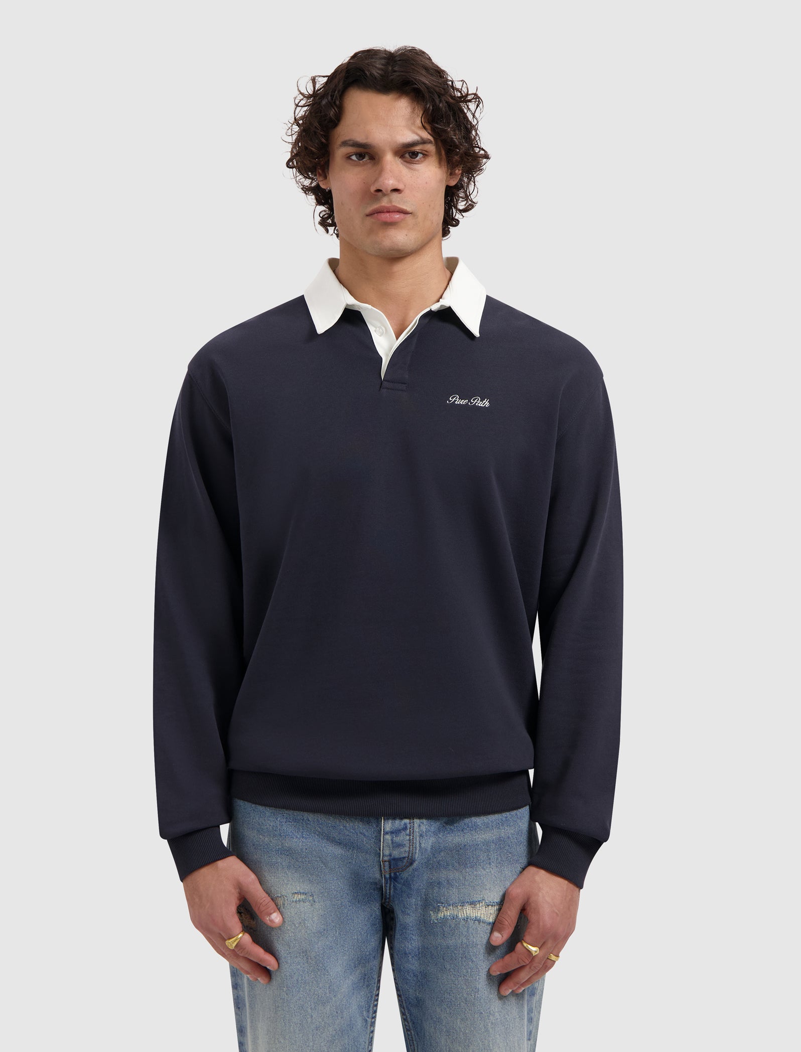The Eric Regular Fit Jeans has a regular fit with a straight leg, crafted from 100% cotton denim for a firm and authentic feel. Finished in a blue green tone with a tinted and stone wash, shaped by whiskers and pronounced rip and repair details for a worn in character. Designed with a button fly, front and back pockets, triangle embroidery and a leather logo patch.